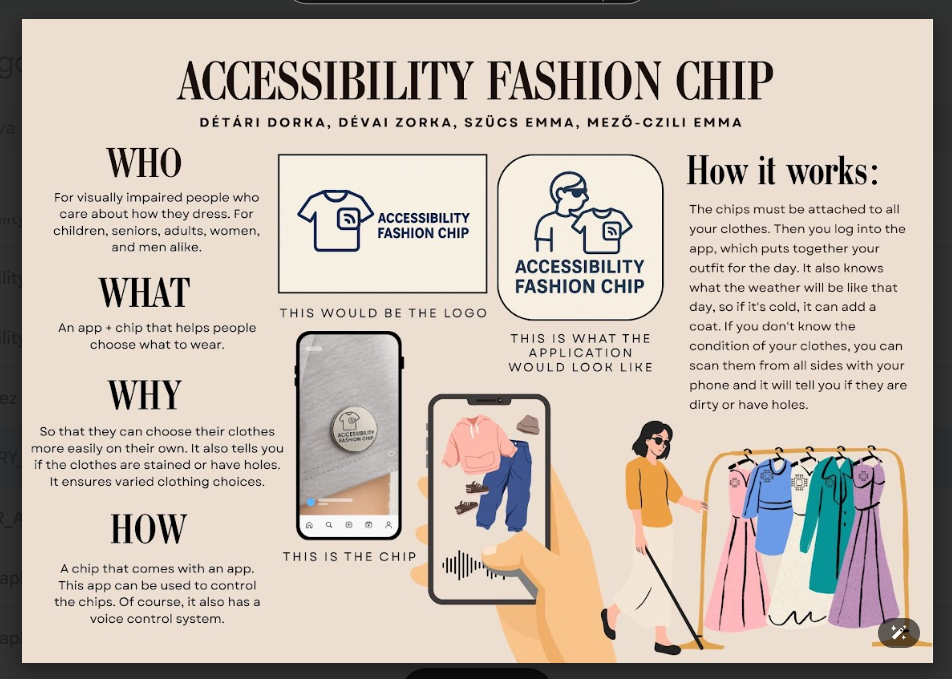 Az AKG diákcsoportja Détári Dorka, Dévai Zorka, Szűcs Emma és Mező-Czili Emma gyengénlátó, vagy vak emberek számára készített mobiltelefonos alkalmazást ahhoz, hogy megkönnyítse számukra az öltözködést. A ruhákon elhelyezett chipet a mobiltelefon érzékeli és elmondja, hogy mi az (mondjuk sötétkék farmer nadrág). Az okos telefon azt is tudja, milyen az idő odakinn, és ezzel is segít a gazdájának, továbbá a telefon optikájával meg lehet „nézni”, hogy tiszta-e és nem szakadt-e el. Így aztán könnyebben össze lehet válogatni az aznapi ruhát.